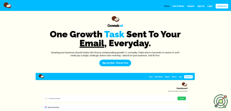 Coconuts AI is a free service that delivers one personalized business growth task to your inbox daily, to help business owners leverage the power of compound growth through consistent 1% improvements.