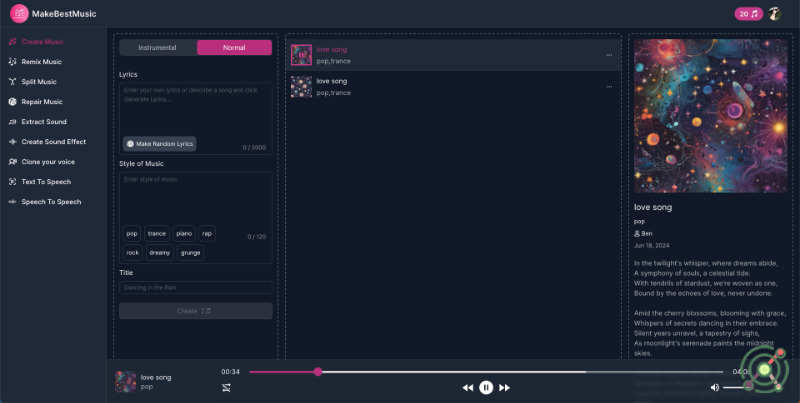 2.Lyric Writer: Helps users create high-quality lyrics based on their descriptions, with options to expand or simplify the lyrics.